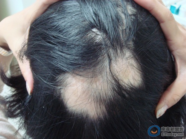 ▲圓形禿掉髮型態,剛掉的區域頭皮處光滑,有時新生的頭髮會是白髮。(圖/徐常捷醫師提供,以下同)